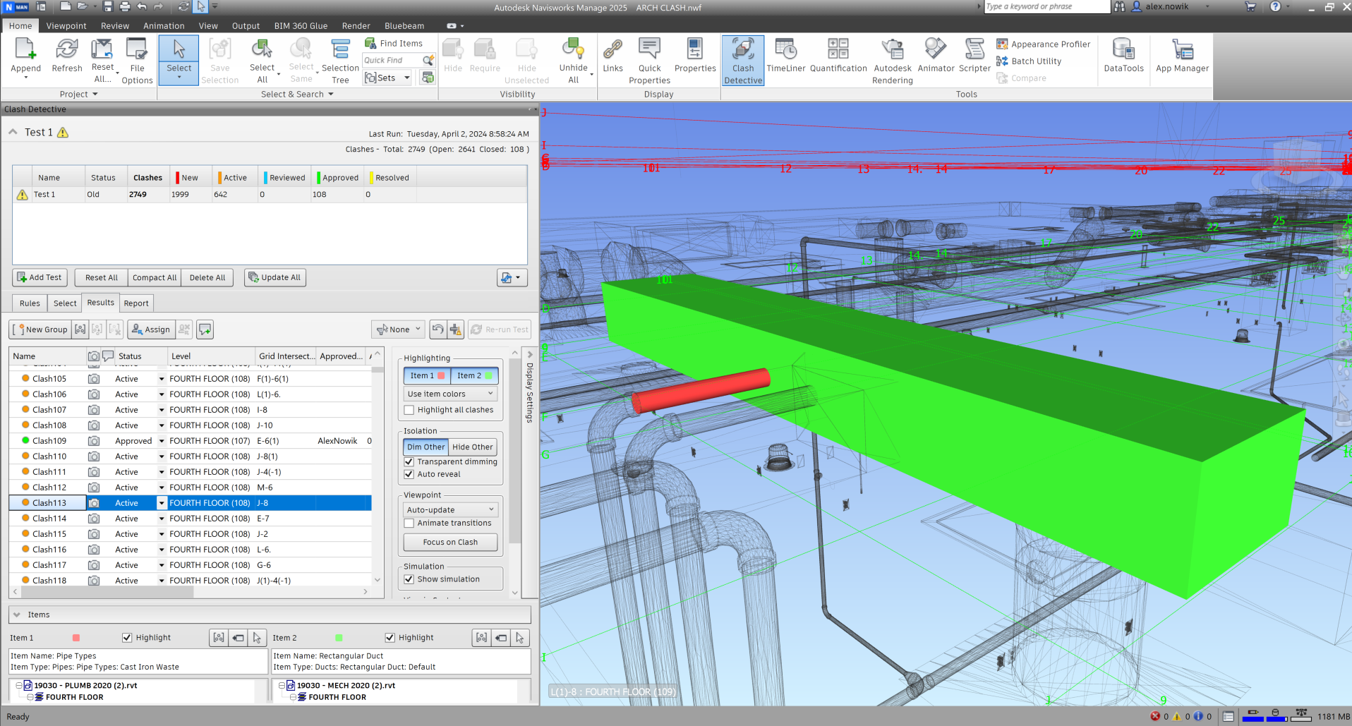 Clash coordination study developed in Autodesk Navisworks, utilizing BIM to identify and resolve system conflicts during preconstruction.