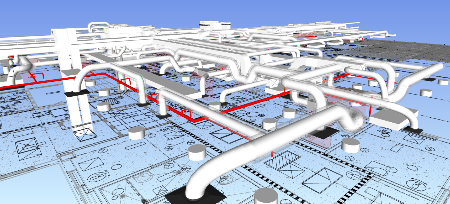 Combined coordination model developed using Autodesk Revit and Navisworks, showing integrated Building Information Modeling (BIM) coordination across MEPF trades during preconstruction.